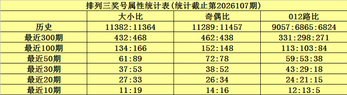 上期回顾:排列三第2026107期奖号为154,奖号012路比为0:2:1,奇偶比为2:1,大小比为1:2,和值为10,跨度为4。